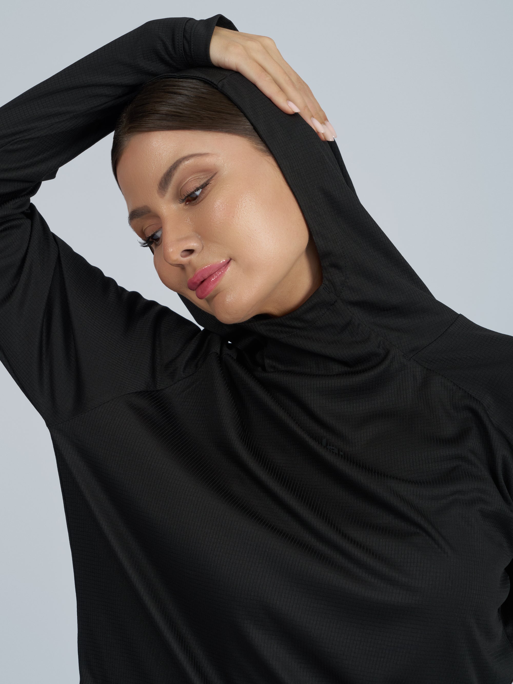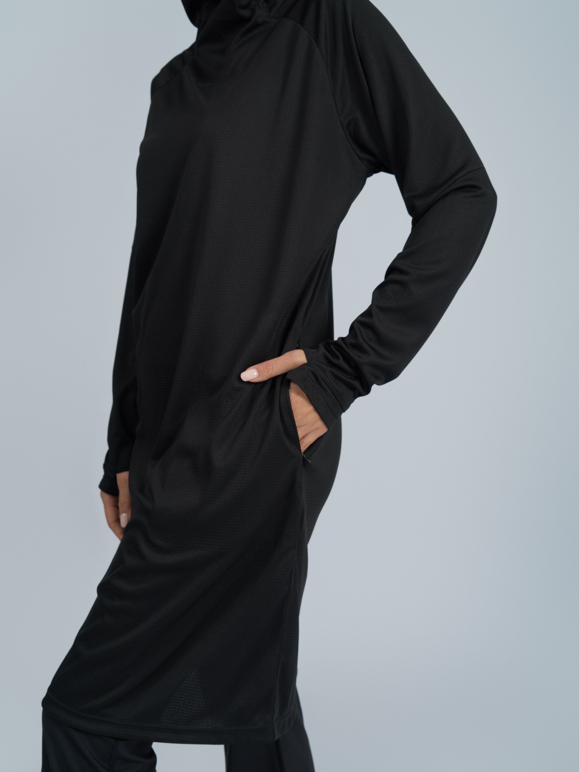 This knee-length performance hoodie features an A-line silhouette and curved seam detailing for a fit that flows with you. Raglan sleeves, thumbholes, and a high neck with bonded hood edges deliver mobility, coverage, and strength — all in one powerful layer.